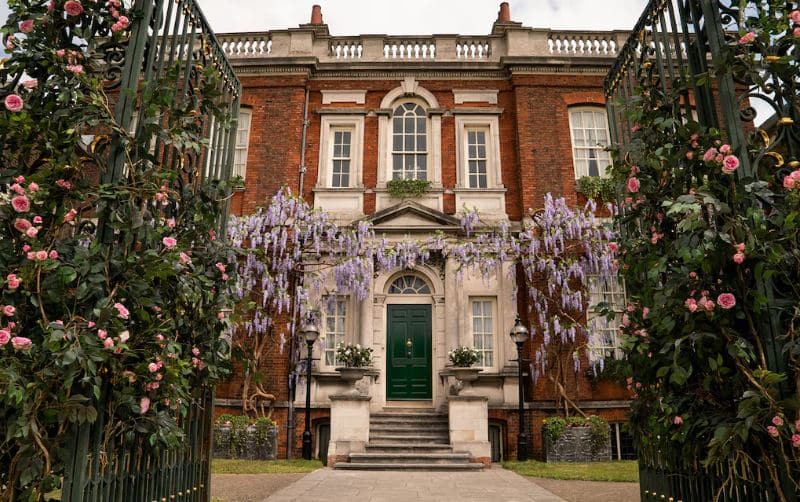 Pour Bridgerton, Shondaland a déployé une ambition rarement vue à la télévision. Les décors ont été tournés dans plus d’une douzaine de lieux réels à travers l’Angleterre, puis complétés par des reconstitutions en studio. La demeure des Bridgerton est filmée à Ranger’s House, une élégante villa géorgienne de Greenwich (Londres), dont la façade en briques rouges et les jardins symétriques incarnent l’idéal aristocratique de l’époque.
